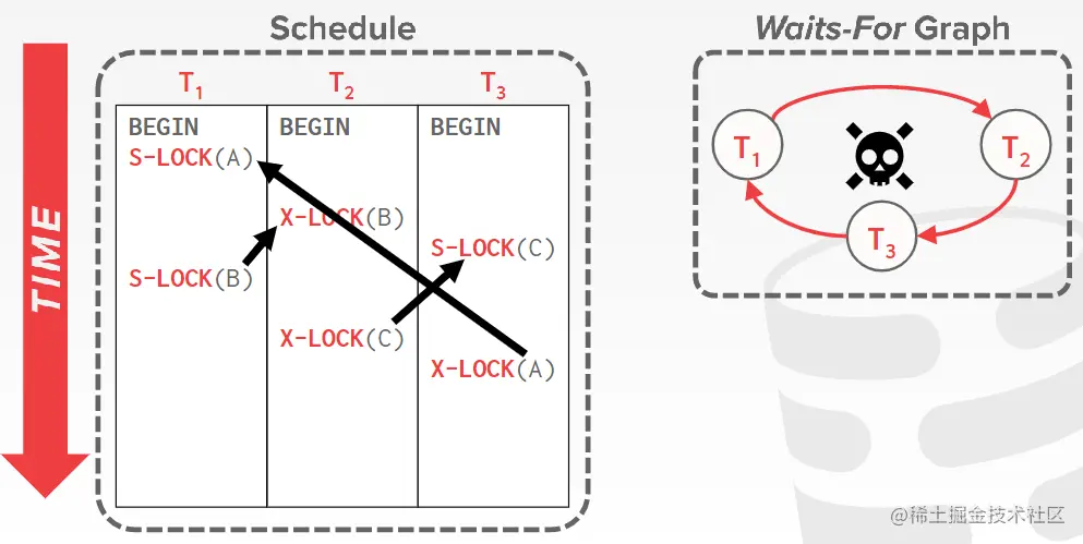 两阶段锁机制很容易出现事务之间发生死锁的情况,例如:当T1’在扩张阶段,获取了Y的读锁,并读取了Y,此时想要去获取X的写锁,却发现T2’的读锁锁定了X,而T2’也想要获取Y的写锁。简而言之,T1’不得到X是不会释放Y的,T2’不得到Y也是不会释放X的,这便陷入了循环,便形成了死锁。处理两阶段锁中的死锁有两种方法:检测和预防。