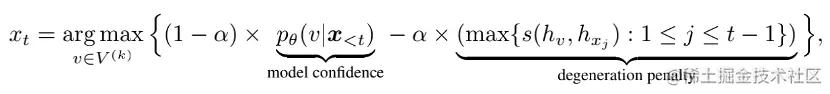 其中为当前步骤模型置信度最高的个候选词,为模型置信度,为惩罚项,通过计算候选词与前文单词的余弦相似度得到。这一项表明,算法倾向于选择和前文区分度高的单词。