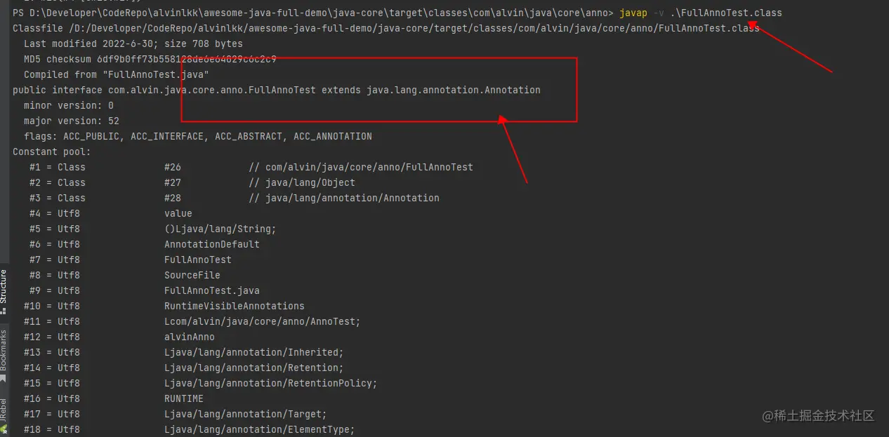 我们先通过反编译查看注解生成的字节码,可以通过javap -v FullAnnoTest.class查看如下: