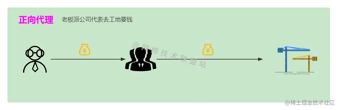 正向代理就好像,一个公司老板要去某个工地上要钱,老板不直接去,会派公司代表去,这个公司的代表其实就是代理服务器,代公司去处理事务,这个对于老板——>工地是正向代理的关系。