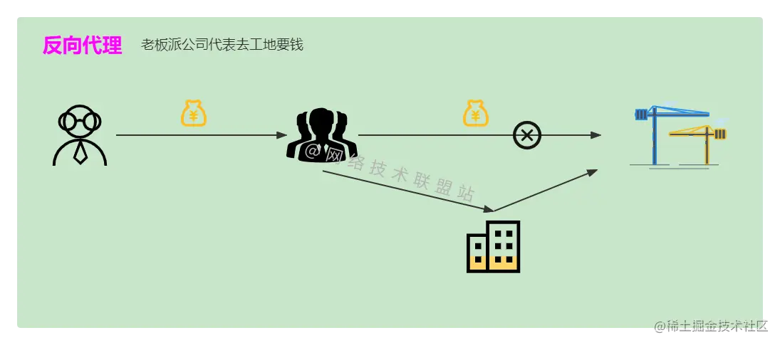 反向代理就好像,去要钱的时候,工地很聪明,知道自己不想那么烦,就找了一个代账公司,这个代账公司对外就是代表这个工地,所以看起来和公司主体没有啥区别,那么这个代账公司就是反向代理的服务器。