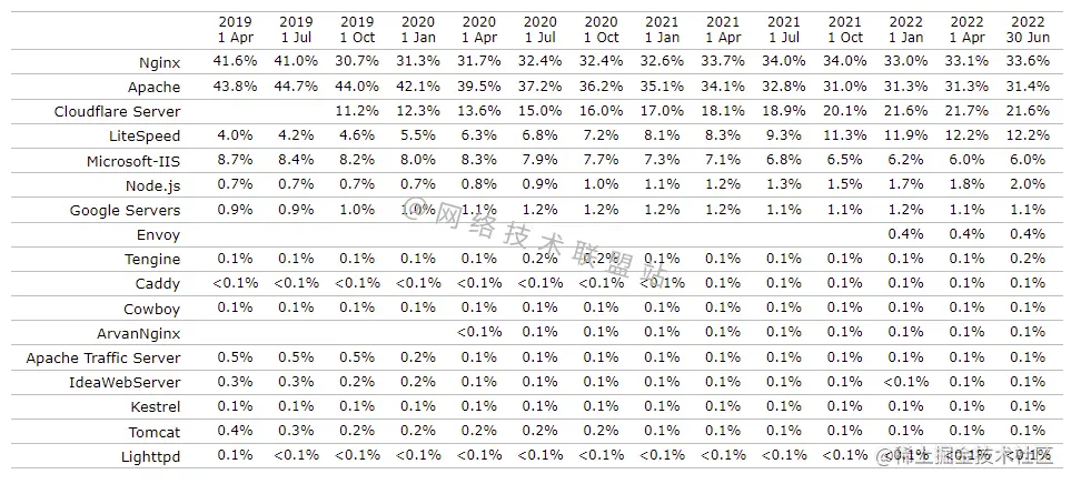 Nginx是一个开源的 Web 服务器,可以作为反向代理,根据知名统计网站统计,Nginx 的市场份额一直在稳步增长,并且已经超过 Apache: