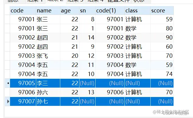 两张表一张学生表(student ) 一张成绩表(score) 共同列 为学号(code)