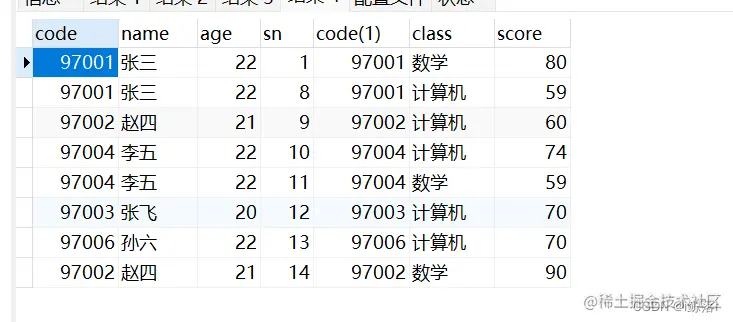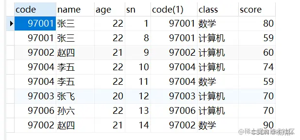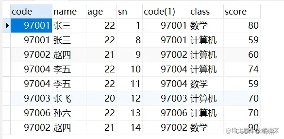 JOIN score AS b ON a.`code` = b.`code` #默认内连接