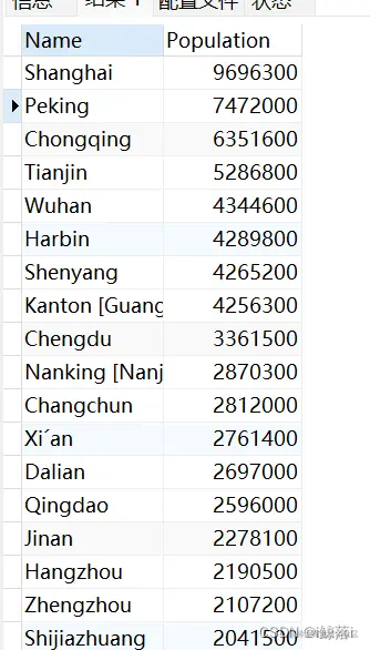 1、查询中国的所有城市和人口数量