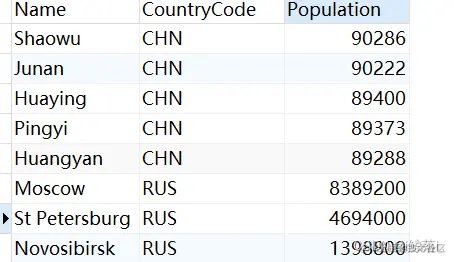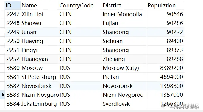 2、 查询所有中国与俄罗斯的城市与人口数