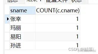 思路:将多表连起来---设置别名---找关键字段----通过名字去重-----统计有多少课程---并将课程少于两个的查询出来
