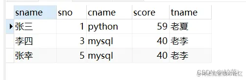 3、查询成绩小于60的 学生名字,学号,科目,成绩,科目老师名字