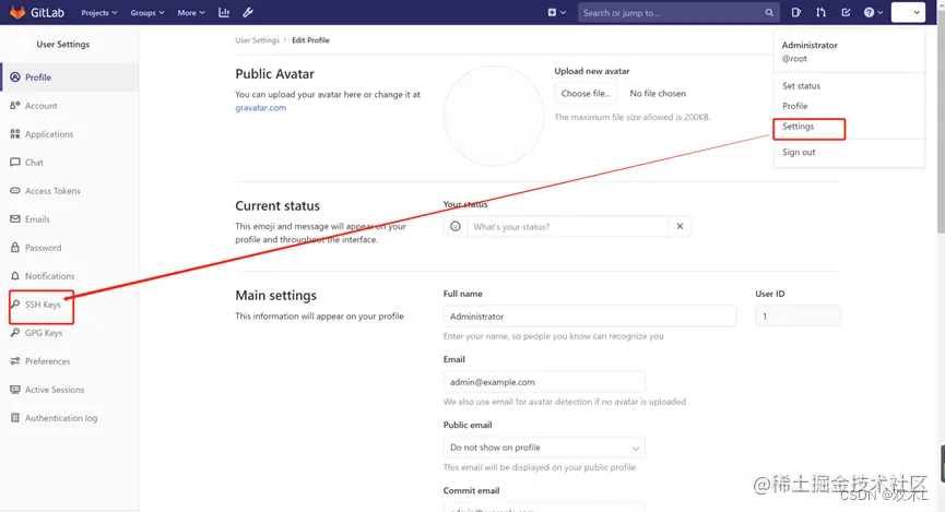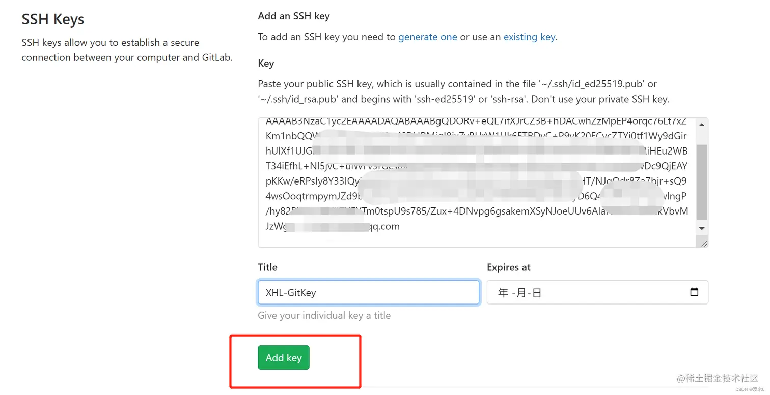 2)生成公钥和私钥之后,将公钥(id_rsa.pub)添加到gitlab的服务器上,如下图操作: