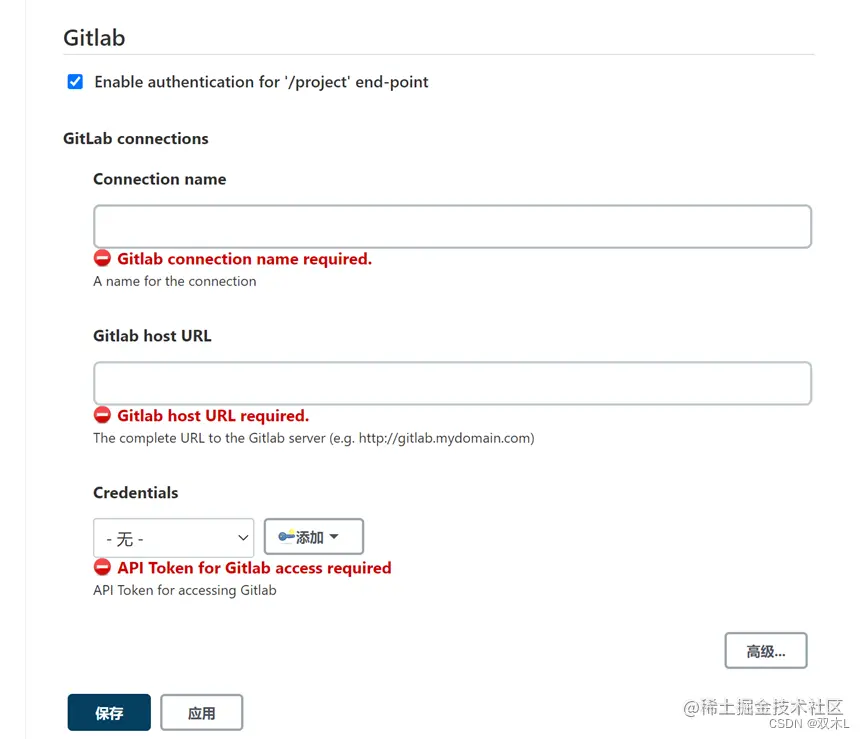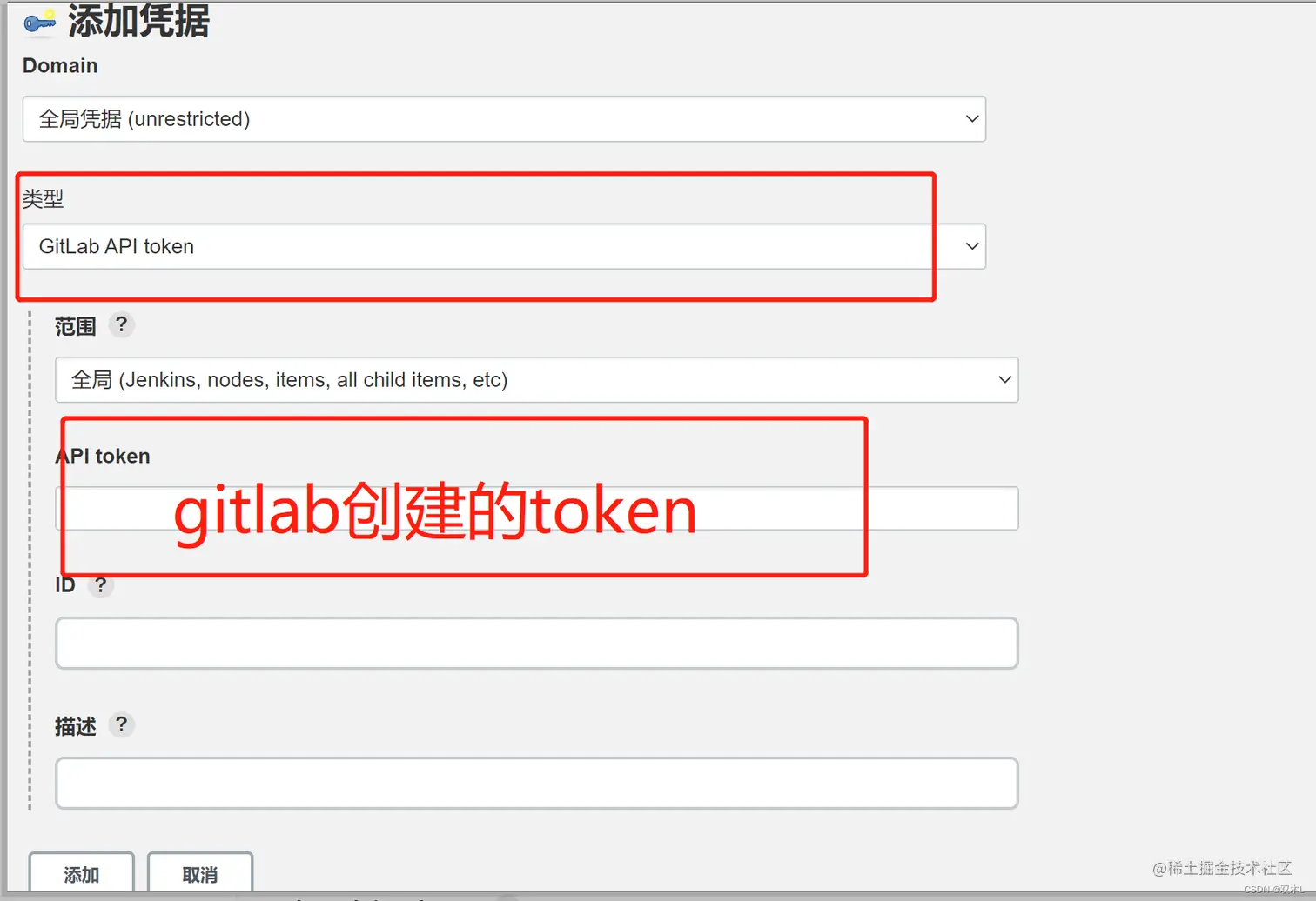 名字随便起,然后就是GItlab的地址,第三点【Credentials】需要添加token,就是我们上面在gitlab创建的access token,点击【添加】,选择Jenkins,弹框如下: