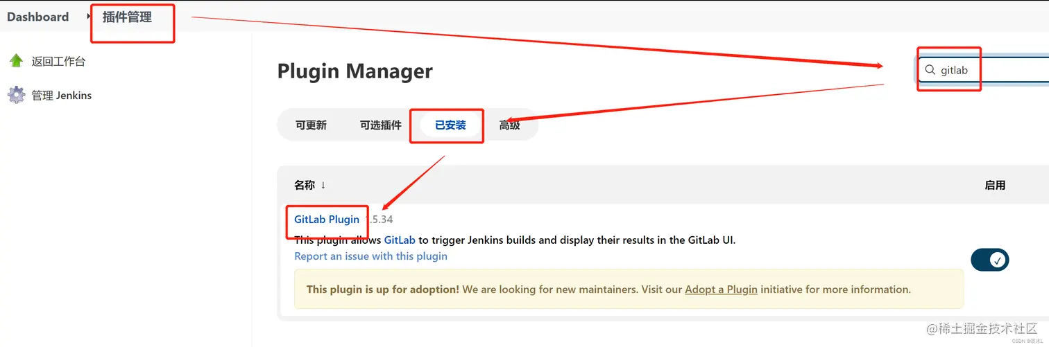 安装方式同上,详细不再阐述,直接搜索gitlab即可,如下图是安装完毕的插件