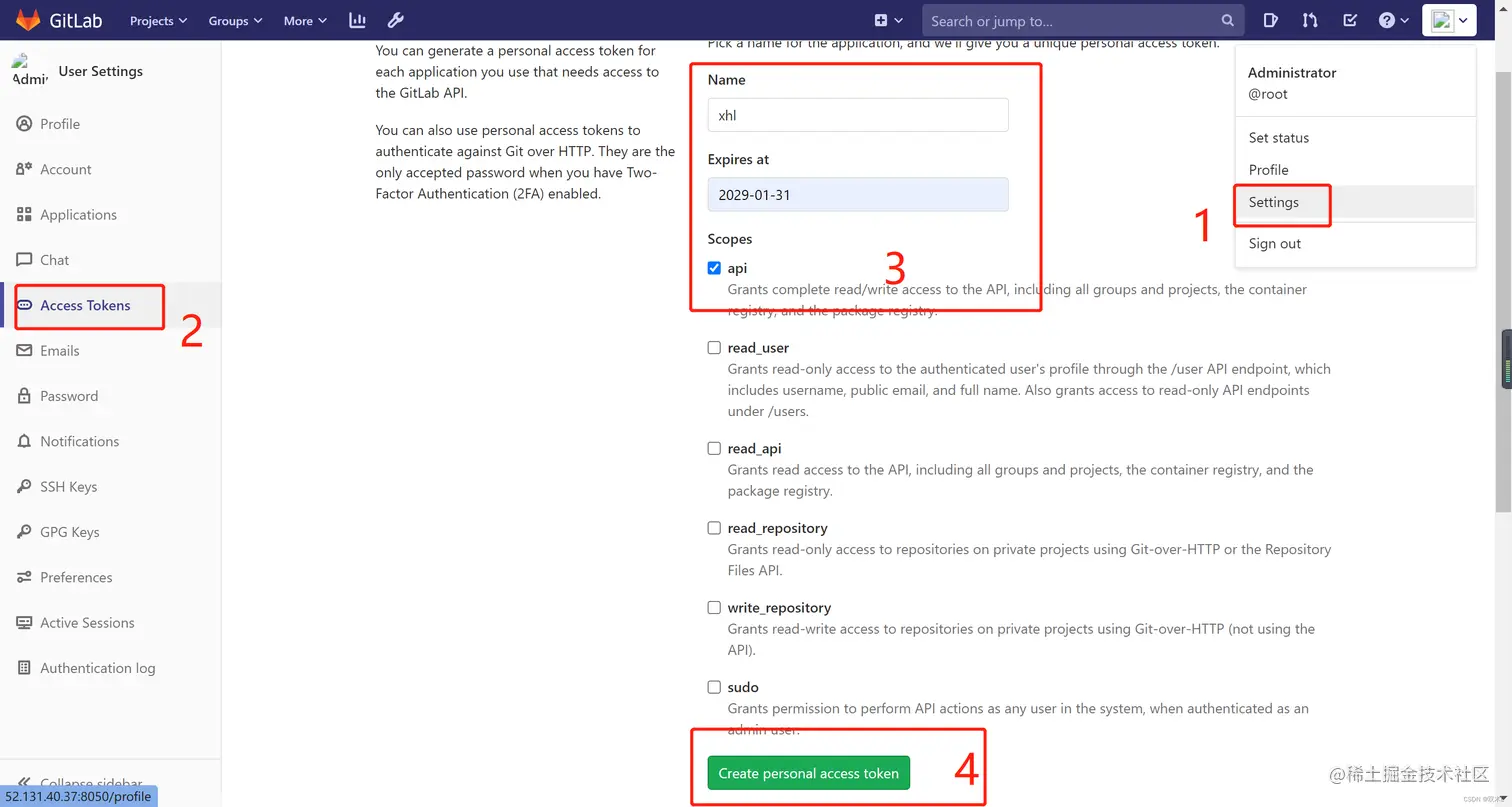 Gitlab如何创建access token,按照如下图四个步骤创建即可