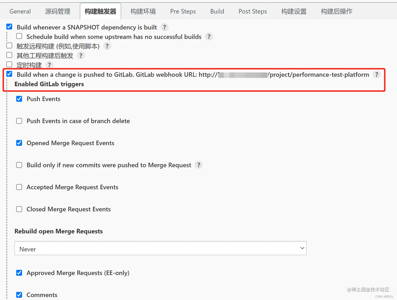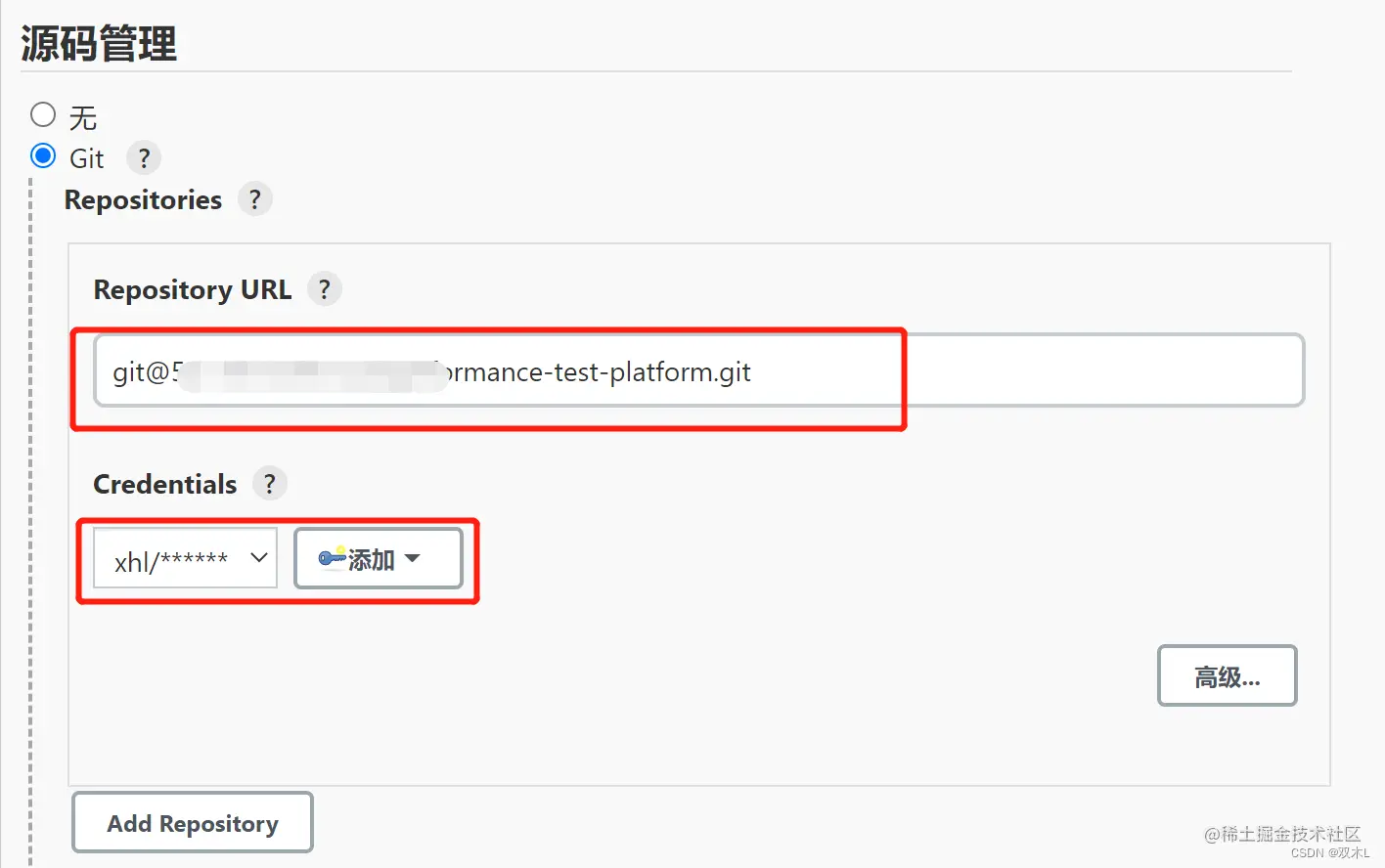 填写我们gitlab上SSH方式的项目地址,然后Credentials模块点击【添加】,以用户和密码的方式创建访问凭证,这里的账号和密码是指可以从gitlab上更新下载代码的账号信息