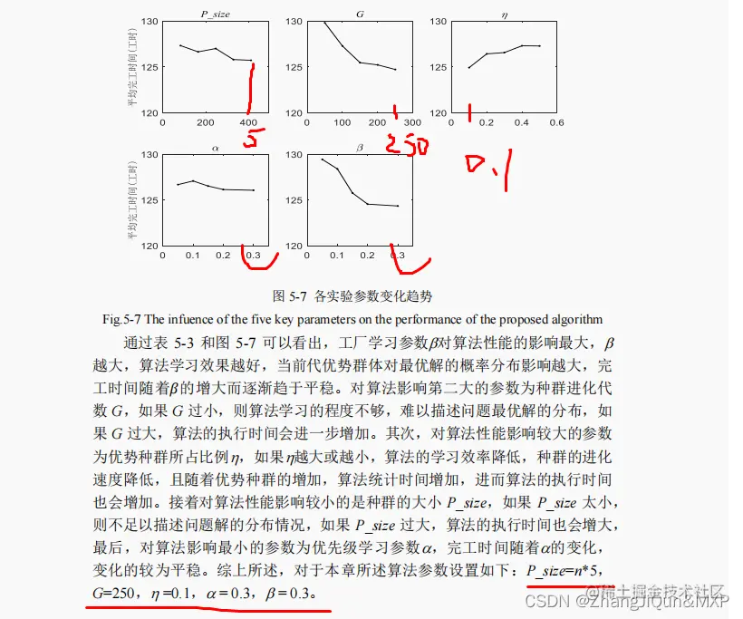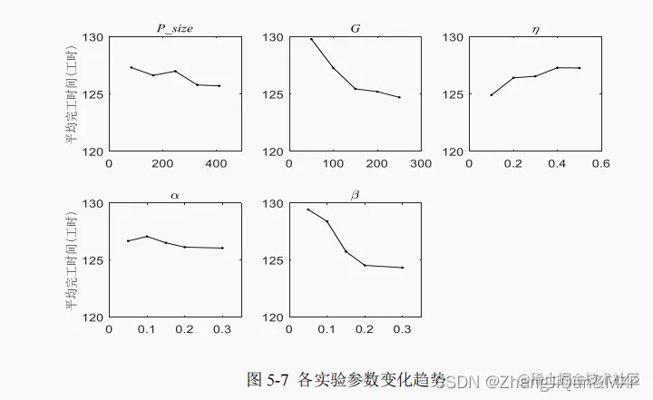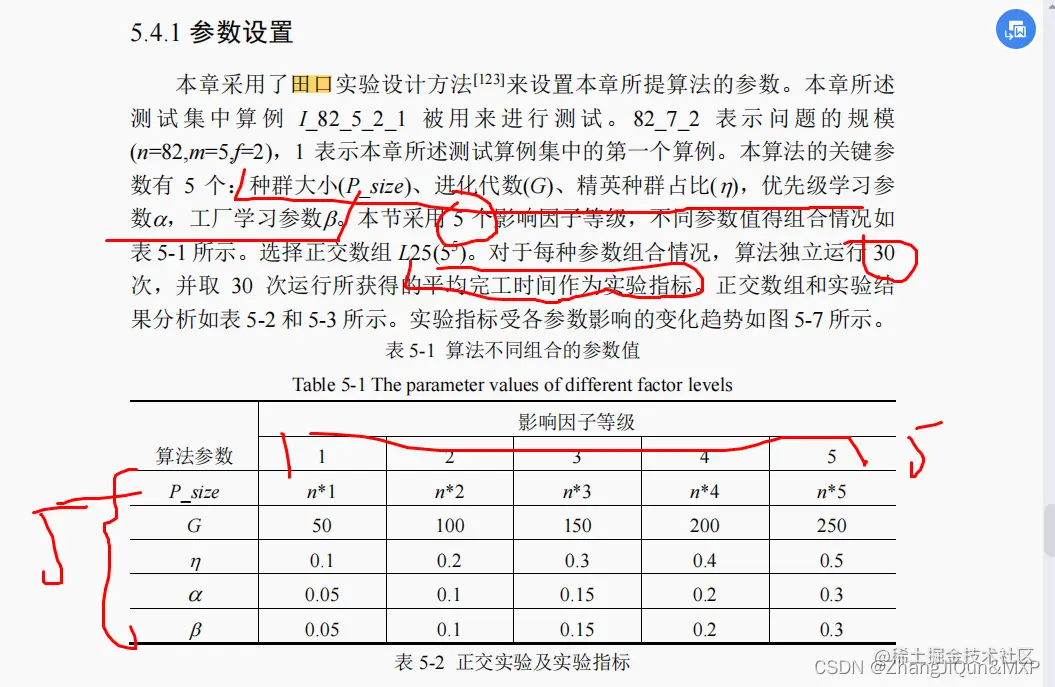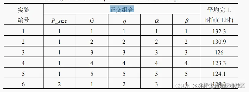 数有 5 个:种群大小(P_size)、进化代数(G)、精英种群占比,优先级学习参 数,工厂学习参数。本节采用 5 个影响因子等级,不同参数值得组合情况如 表 5-1 所示。选择正交数组 L25(55)。对于每种参数组合情况,算法独立运行 30 次,并取 30 次运行所获得的平均完工时间作为实验指标。正交数组和实验结果分析如表 5-2 和 5-3 所示。