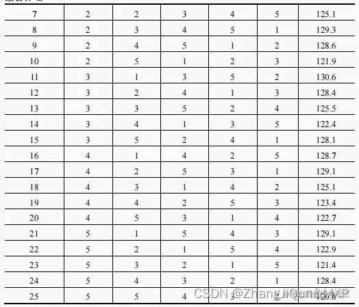参数设置:选参数5个,划分5等级,采用正交实验就是25种。