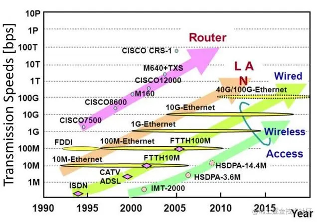 25年来,路由器、有线和无线的网络速率增长了1000倍