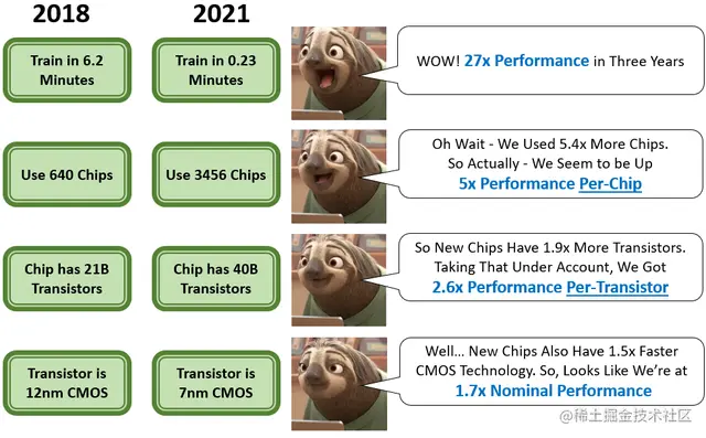 于是,马上就有人说,“如果我们比摩尔定律快这么多,那么大部分的性能提升肯定都不是因为我们使用了更好的半导体技术,而是因为采用了更好的加速方法和软件技术。”然而,他们的结论并不可靠。因为他们没有规范化的标准来衡量性能,所以才忽视了硬件对性能优化所做的贡献。
