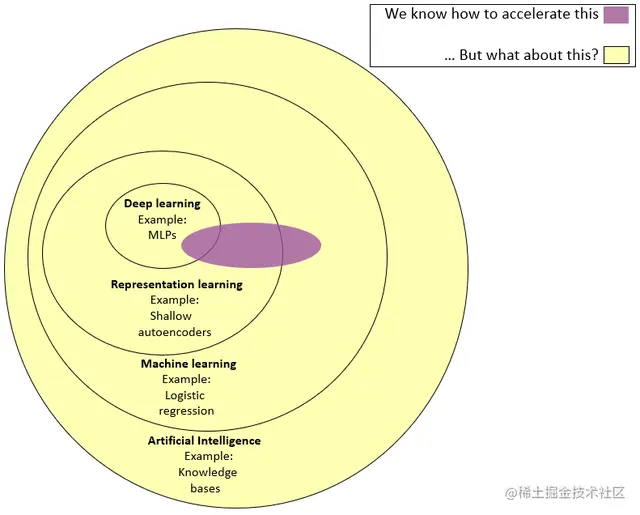 有人可能会说,“好吧,我们几乎都听说过深度学习,它是当今最具价值的‘杀手级应用’”,但这正是关键所在———我们主要研究深度学习,因为算法库和硬件都是为深度学习量身定制的,因此深度学习是我们目前能够探索的领域,这是开发加速硬件时需要注意的。