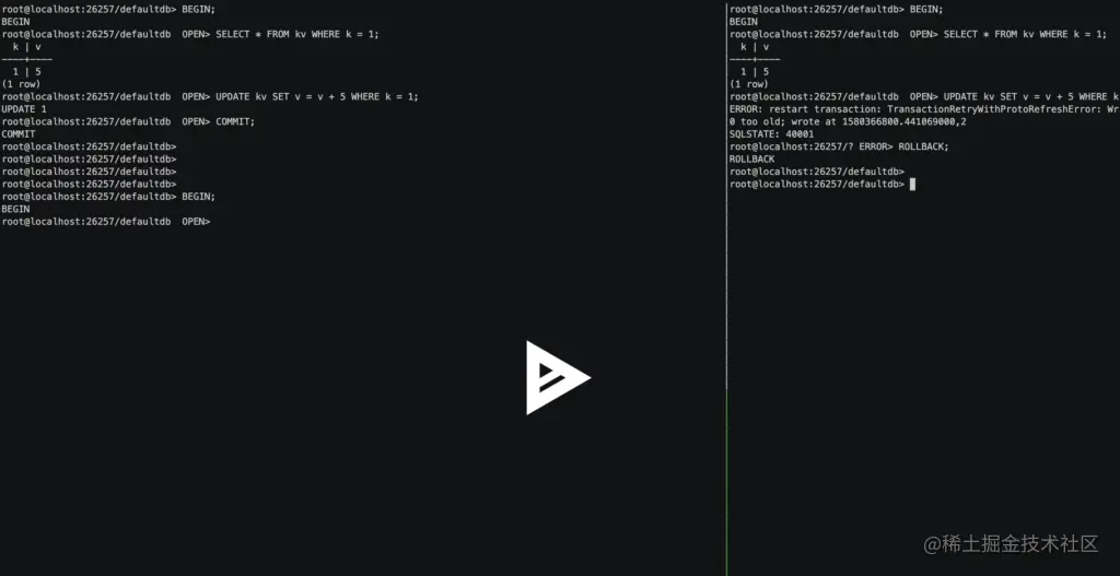 在下面的GIF中,我们演示了SELECT FOR UPDATE避免了客户端事务重试错误。