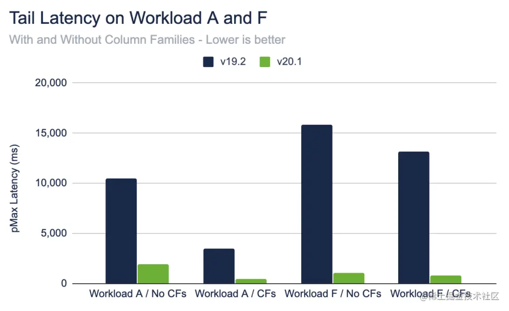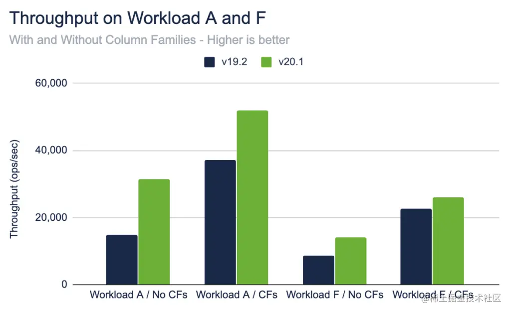 在v19.2和v20.1之间,YCSB的吞吐量(操作/秒)在所有情况下都有所提高:工作负载A,工作负载F,有列族和无列族。更大的队列响应能力和减少了因交易重试而导致的激动,并提高了系统吞吐量。