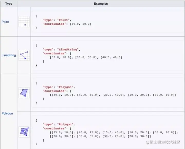 GeoJSON 是用 JSON 的语法表达和存储地理数据,对于Web应用来说,GeoJSON是应用最广的数据格式了。GeoJSON支持下面几何类型:点、线、面、多点、多线、多面和几何集合。