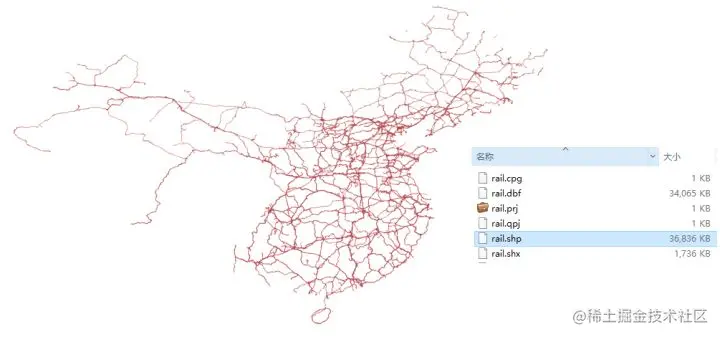 ShapeFile(也简写成shp)是一组文件的集合,如下图铁路线数据就是由众多不同后缀的文件组成。优势为兼容性好、应用广泛,但从数据共享、传输的角度来说无法满足互联网时代网络传输共享数据的需求,所以后来才有了GeoJSON文件格式。