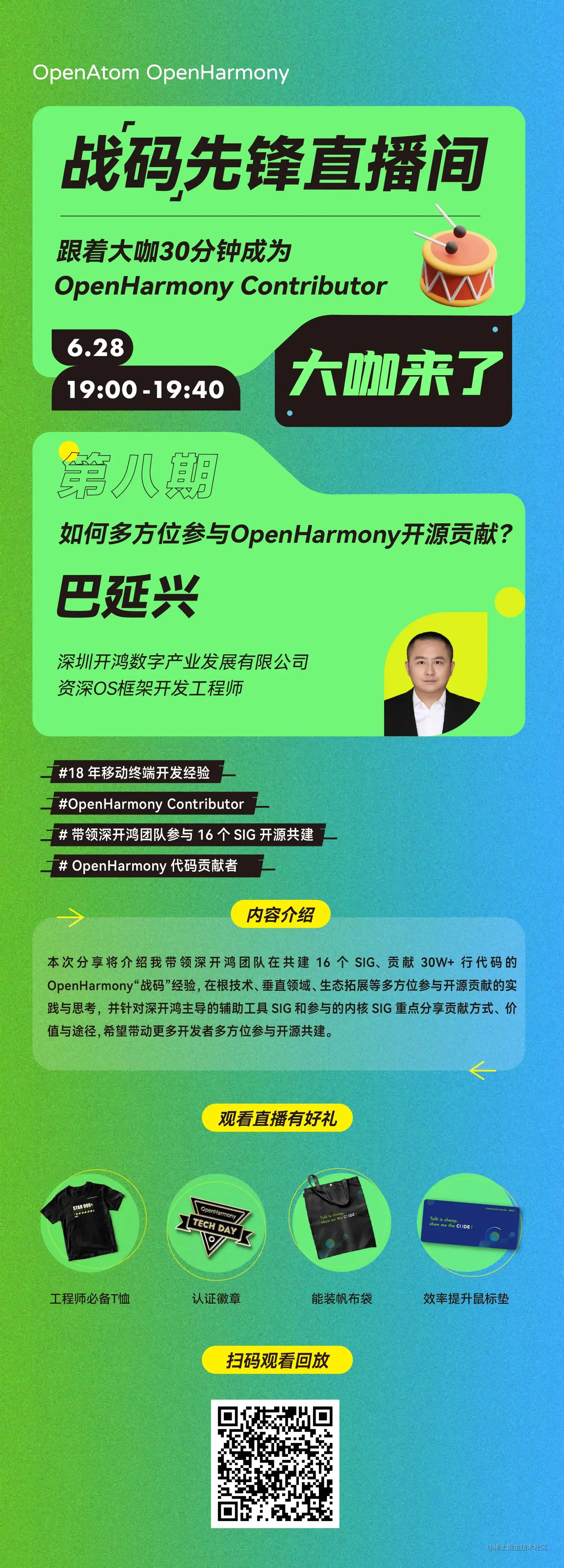 6月28日晚19点,战“码”先锋首期第8节直播《如何多方位参与OpenHarmony开源贡献》,在OpenHarmony社群内成功举行。