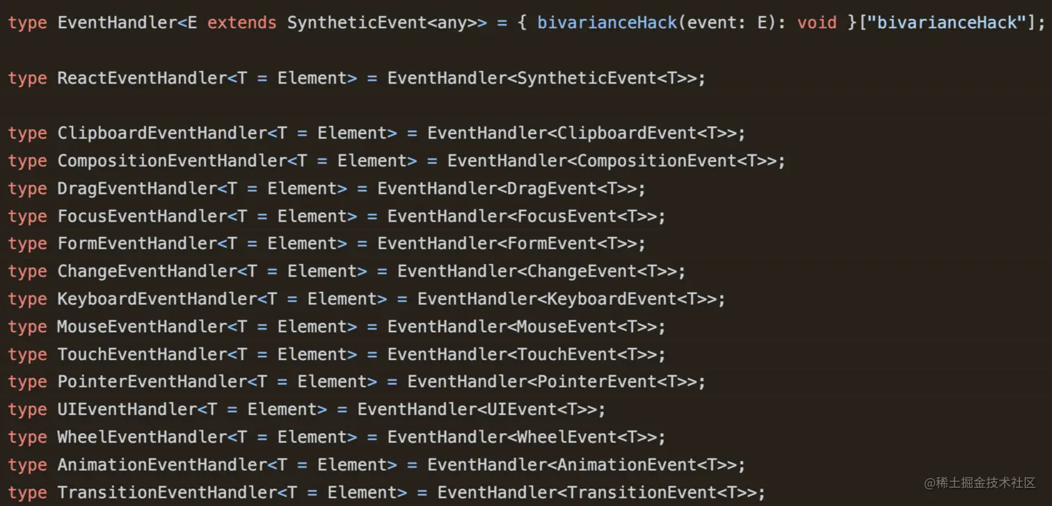 React 声明文件所提供的 EventHandler 类型别名,通过不同事件的 EventHandler 的类型别名来定义事件处理函数的类型,更方便定义其函数类型。