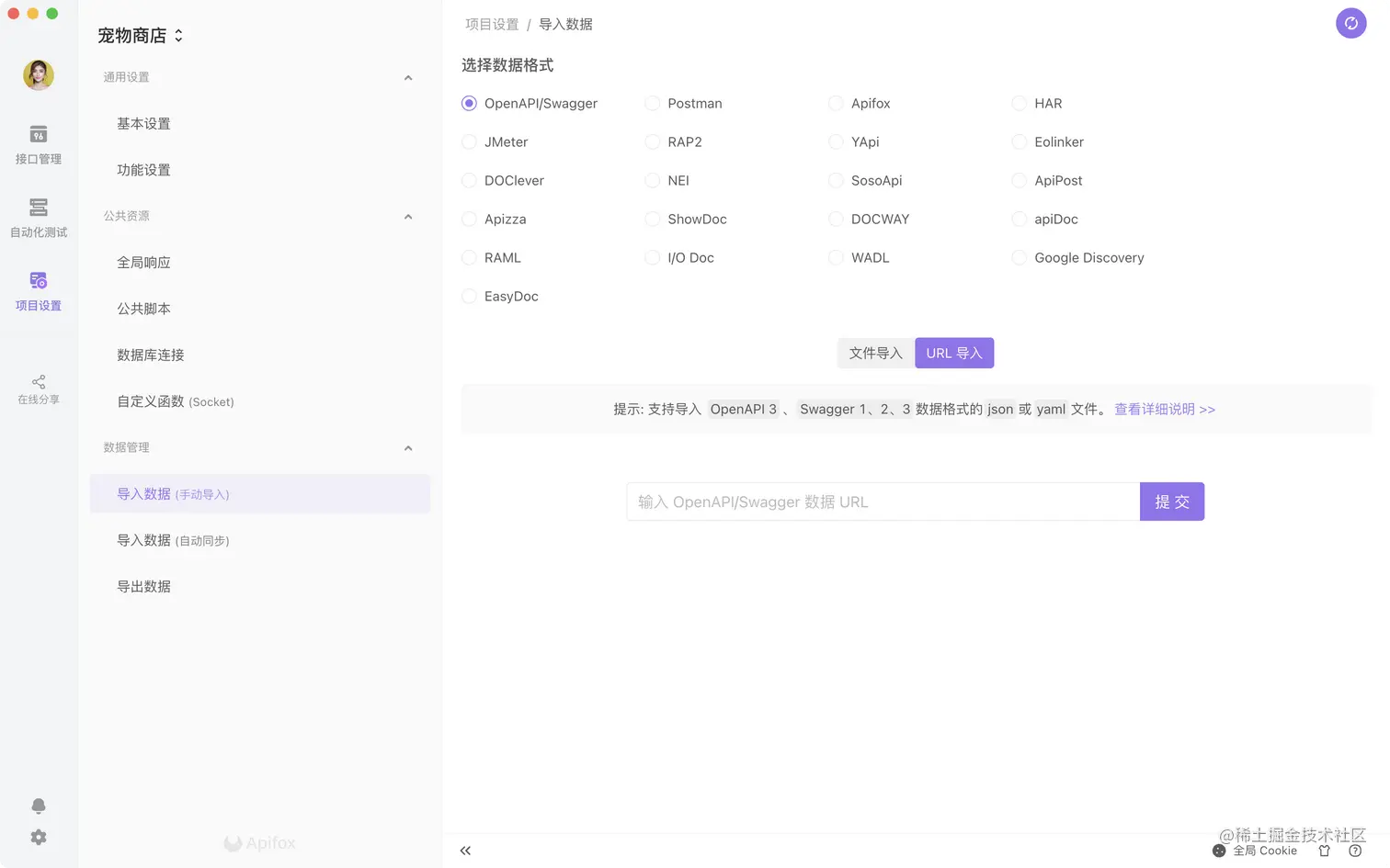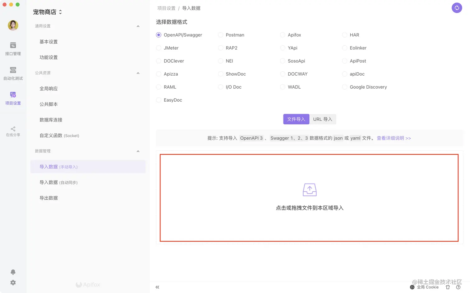 支持导入 OpenAPI 3、Swagger 1、2、3 数据格式的 json 或 yaml 文件。