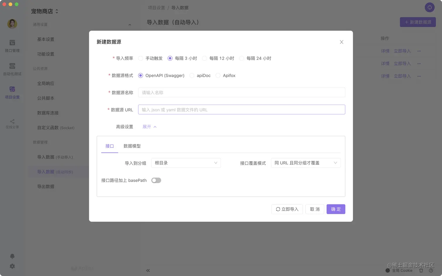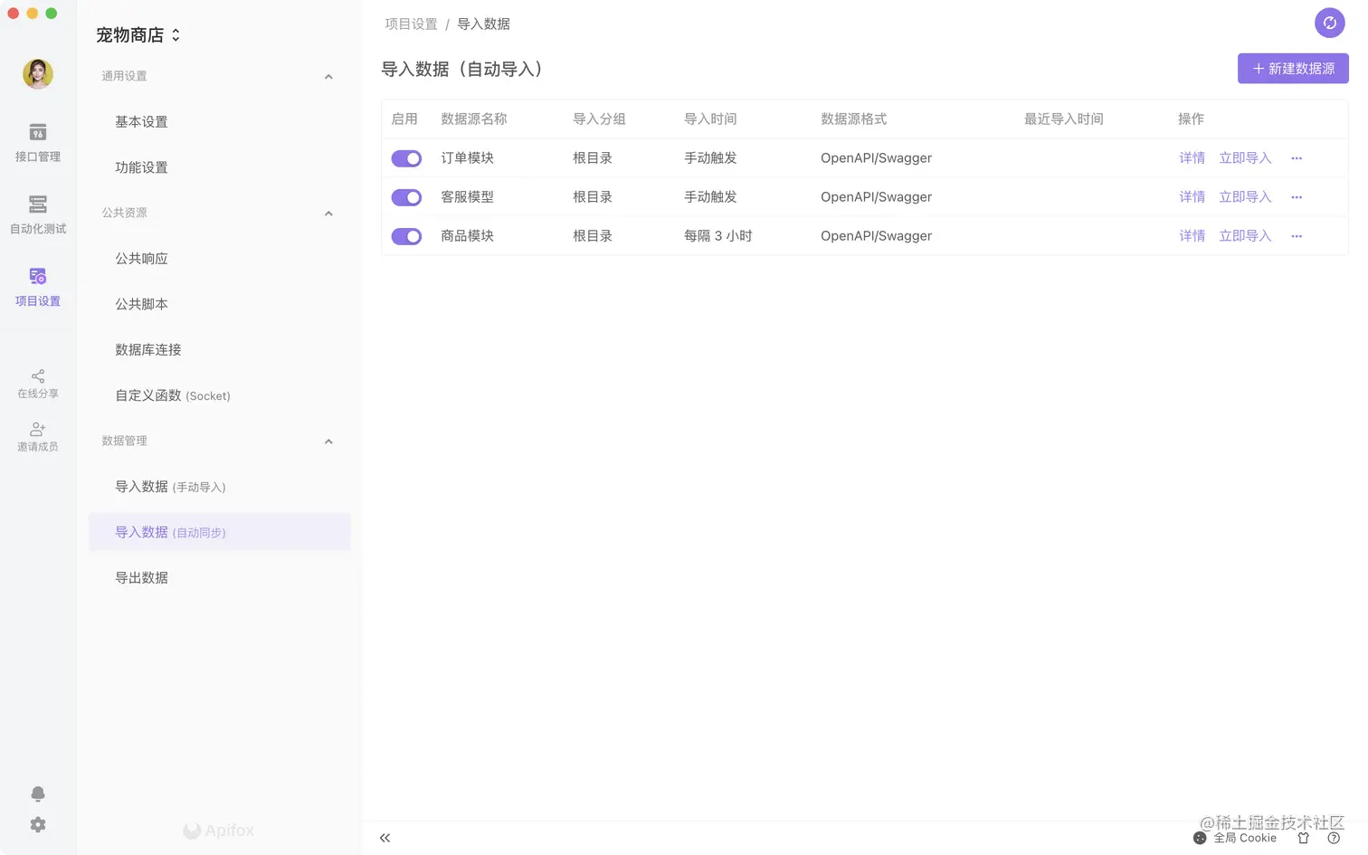 打开 项目设置 面板,点击 自动导入 ,可设置 多个数据源 ,定时同步到 具体分组 中。