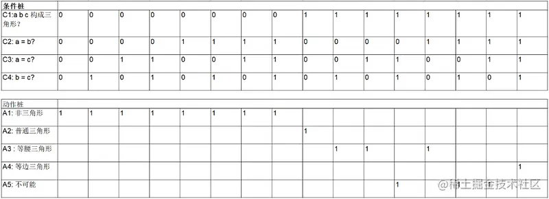 构成三角形的条件如果不满足的话,结果都是非三角形,和下面三个条件无关,这种情况下可以对判定表进行简化。