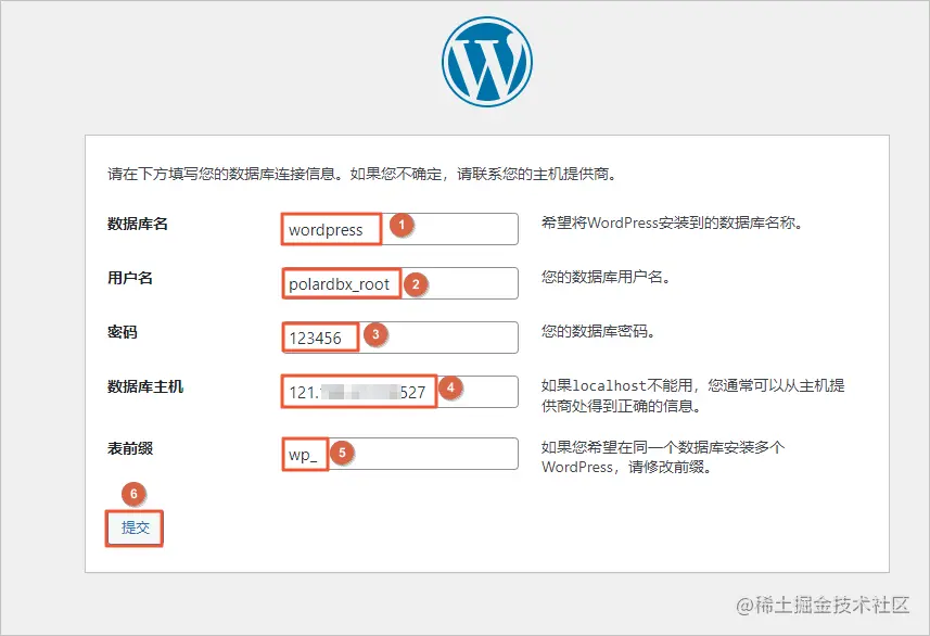 3.4 在数据库配置页面,参考说明配置数据库信息,单击提交。