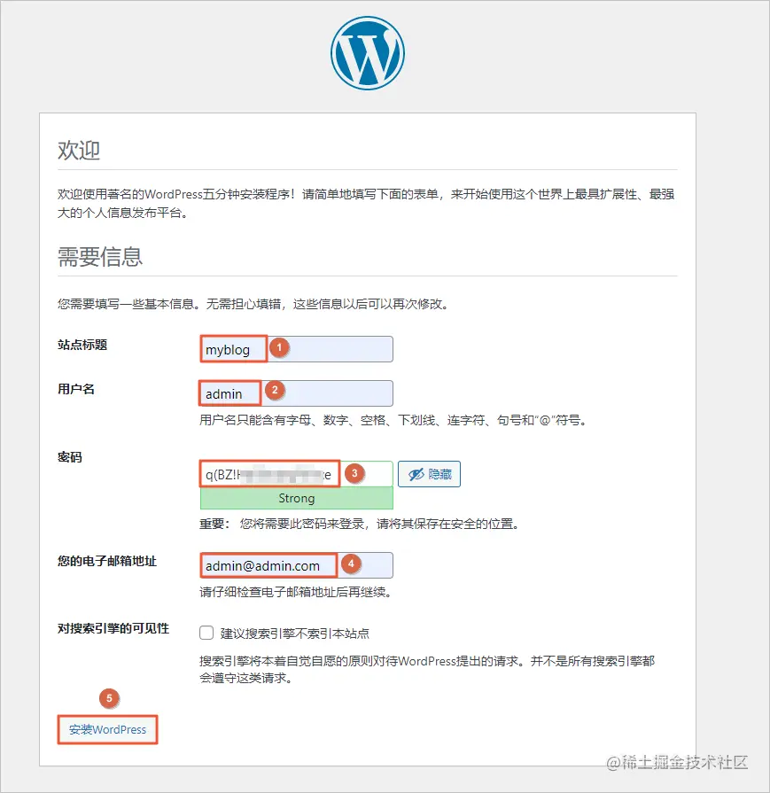 3.6 在信息配置页面,参考说明配置相关信息,单击安装WordPress。