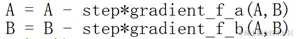 d_a = - gradient_f_a(A,B) + d_a*(gradient_f_a(A,B).ravel().T.dot((gradient_f_a(A,B)-fx_fro_a).ravel()))/(fx_fro_a.ravel().T.dot(fx_fro_a.ravel()))
