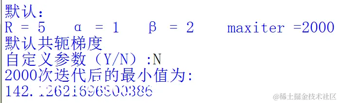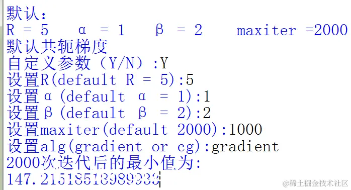 print("默认:" + "\n" + "R = 5" + " " + "α = 1" + " " + "β = 2" + " " + " maxiter =2000" +"\n" "默认共轭梯度")