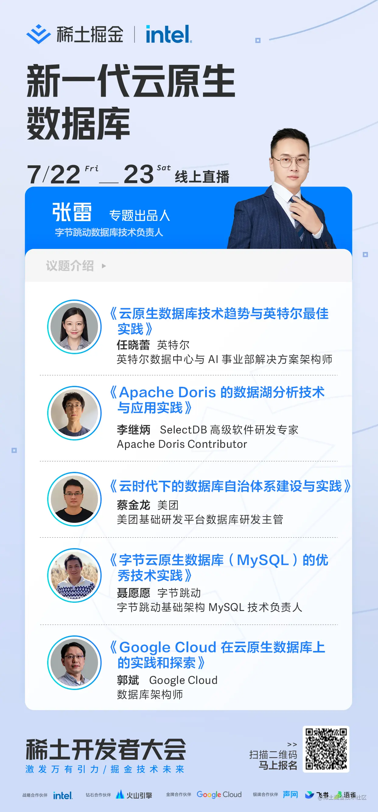 在7 月 22、23 日即将举办的2022 稀土开发者大会上,由字节跳动数据库技术负责人张雷作为出品人的《新一代云原生数据库》专场演讲, 将诚邀各个大厂的核心业务专家为开发者们带来自身从业云原生数据库使用探索中的宝贵经验分享。本届开发者大会免费报名中,点击报名链接或识别海报二维码即可与各位牛人分享交流。