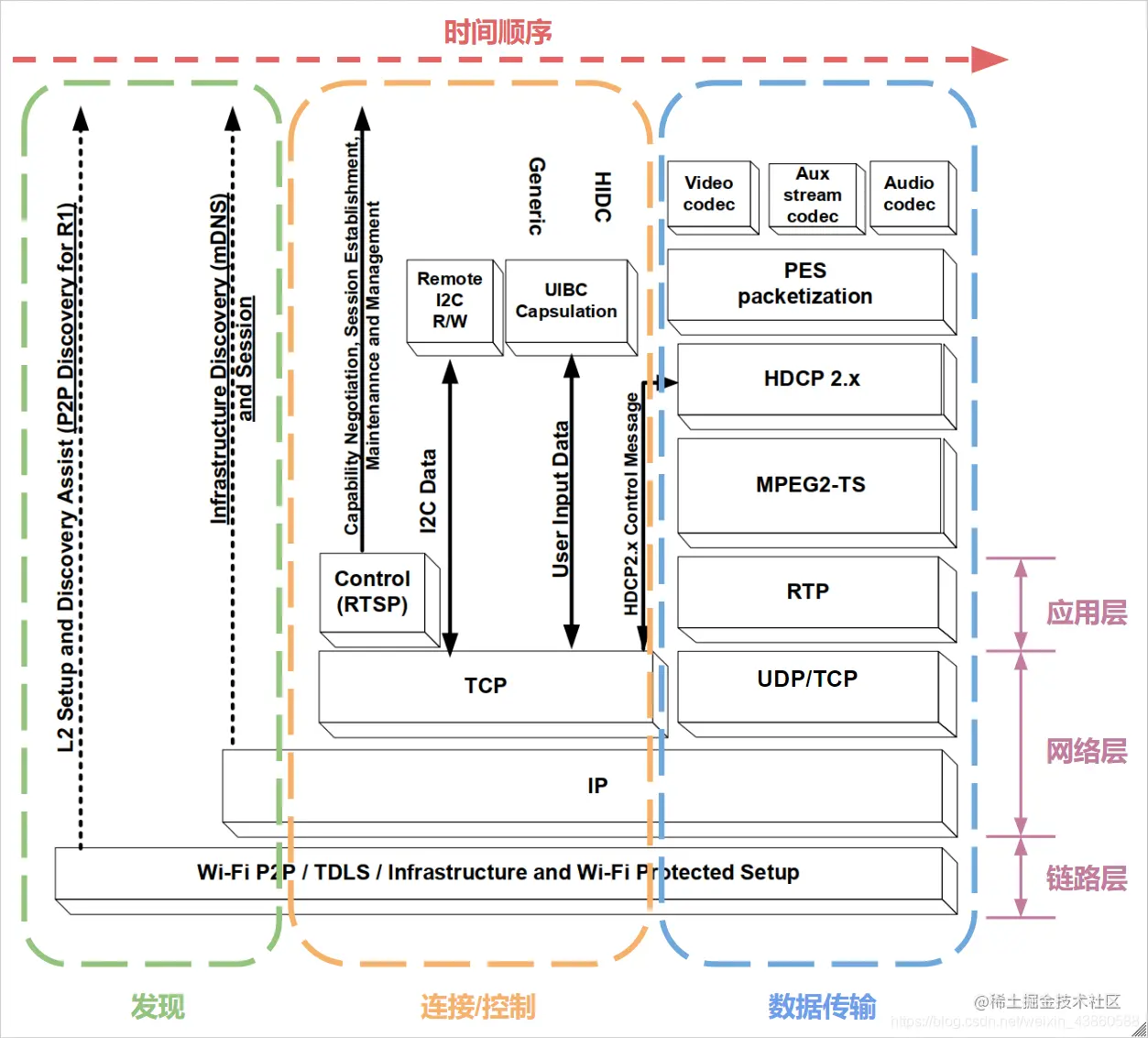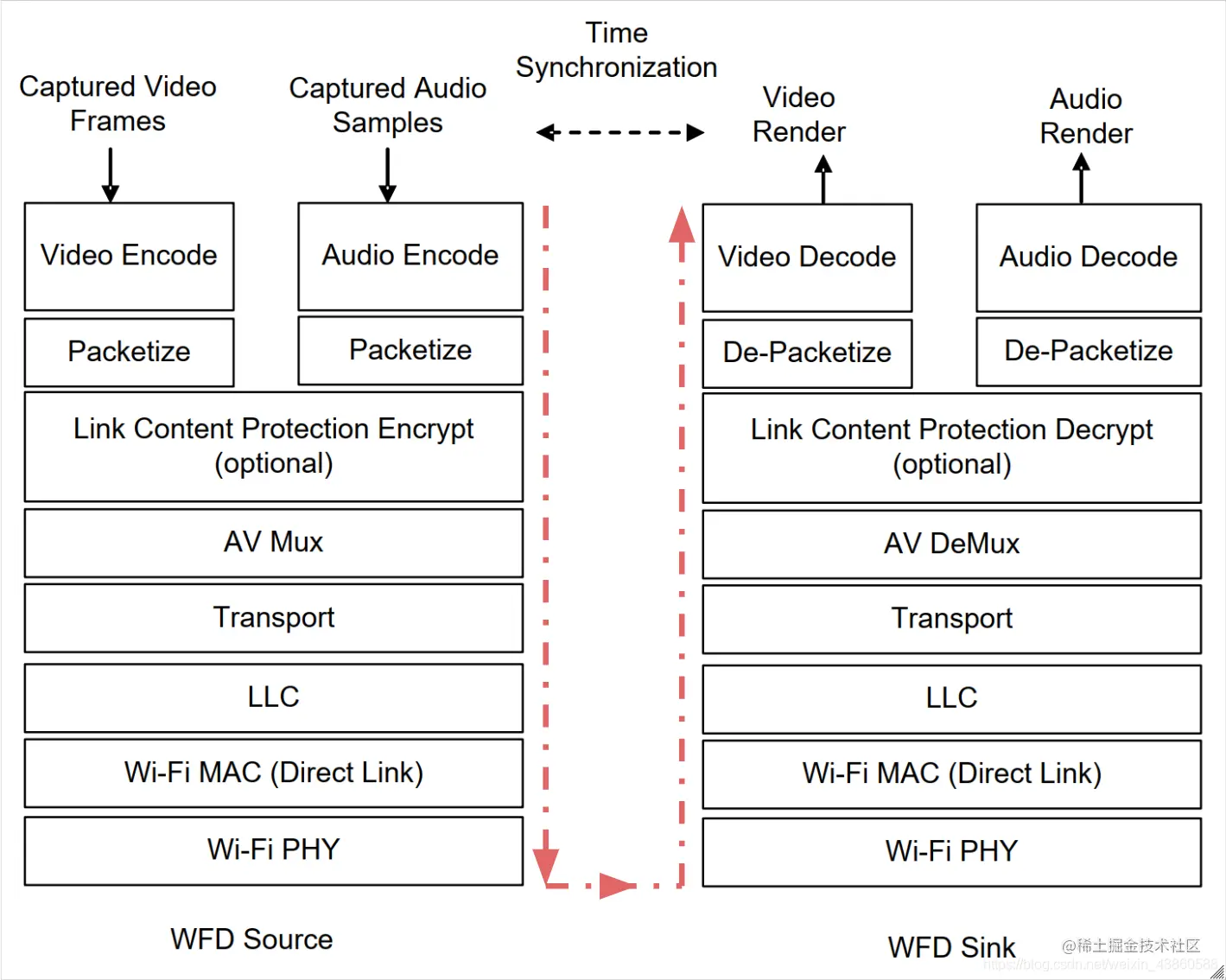 到这一步,我们可以复习一下,整个miracast的架构了,下图是WFD官方的工作模块框图,基本和前面提到的内容是大体对应的。都是按照这个架构去实现软件: