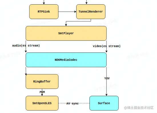SmtPlayer分别给音视频创建一个MediaCodec。视频数据,直接通过releaseOutputBuffer触发surface的渲染。音频通过opensl es进行pcm数据的播放。