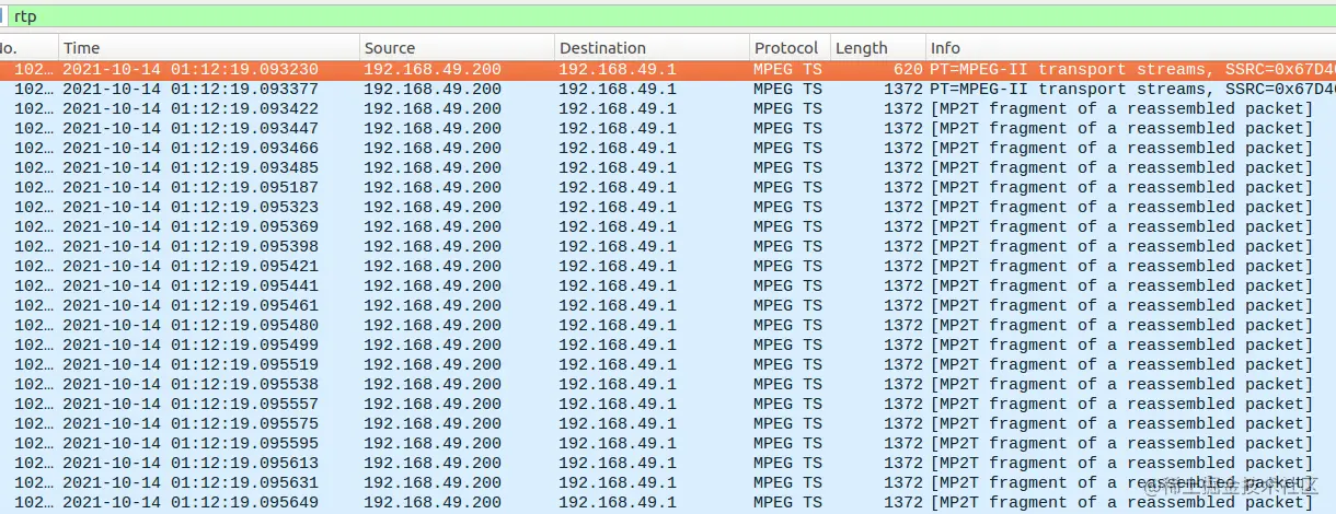 如图,这些包都是192.168.49.200这个设备发给192.168.49.1设备的MPEG-TS。下面总结的时候整个解析过程: