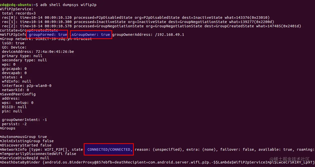 调用成功之后,使用adb shell dumpsys wifip2p可以看到如下内容,和方式二不太一样的是,自带wifi p2p group: