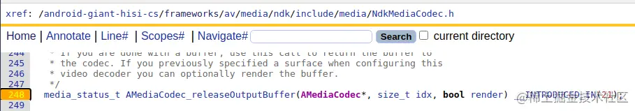 如图的AMediaCodec_releaseOutputBuffer函数原型定义,最后一个bool参数意思是是否要render。视频直接传递true的意思是,数据从解码器解码出YUV数据之后,直接render到surface上就好了,视频播放部分就结束了。而音频解码之后的数据是PCM数据,如果想播放,需要通过传递false。并且从AMediaCodec_getOutputBuffer返回值直接过去音频的原始PCM数据,然后通过MediaPlayer/AudioTrack/OpenSL ES之类的工具去进行播放。这里为了低延迟的需求,选择了OpenSL ES进行音频播放。