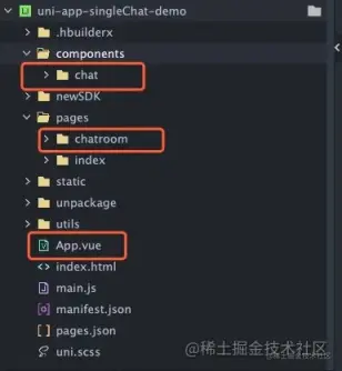 setp5:在示例项目中新建 components 文件夹,分别 copy demo 当中的 components 文件夹下的整个 chat 组件,pages 文件夹下的 chatroom 组件,由于示例项目中的 App.vue 组件没有自己的其他逻辑,所以我直接将 demo 中的 Appp.vue 中的所有代码全部 copy 到示例项目中。