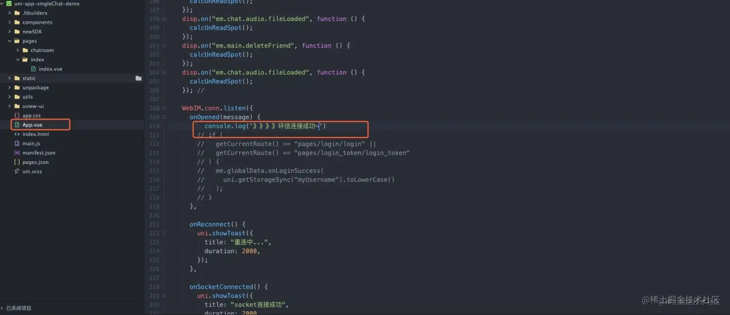 step2:运行项目看 App.vue 中的监听回调--onOpened 回调是否触发(这一步很重要,因为所有功能性接口调用都必须保证环信的连接成功)