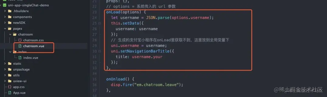 chatroom 组件不需要执行其他操作,onload 直接将路由传递的参数进行了接收:
