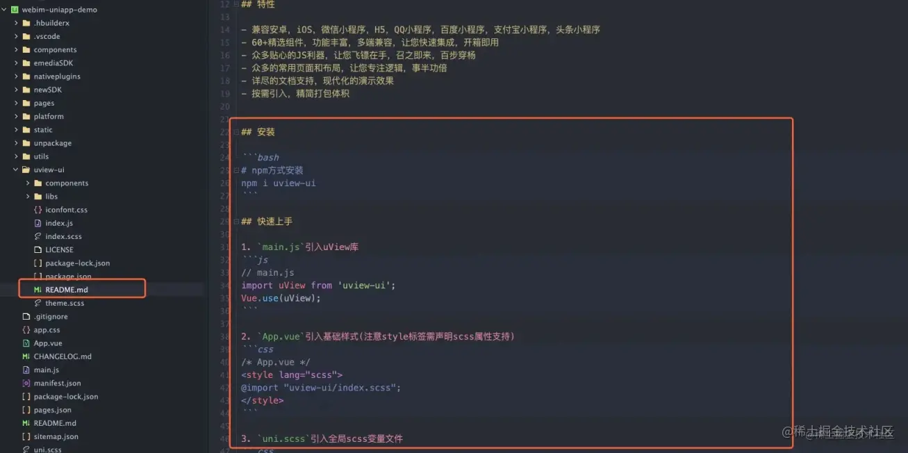 setp4:copy uview-ui 进来,因为组件中有用到这个包的 UI 组件,使用过 UI 组件的朋友应该都知道,除了这个还要引入相应的样式,这个组件的 README.md 中,说明了要进行什么样的配置,这里就不再一一赘述。