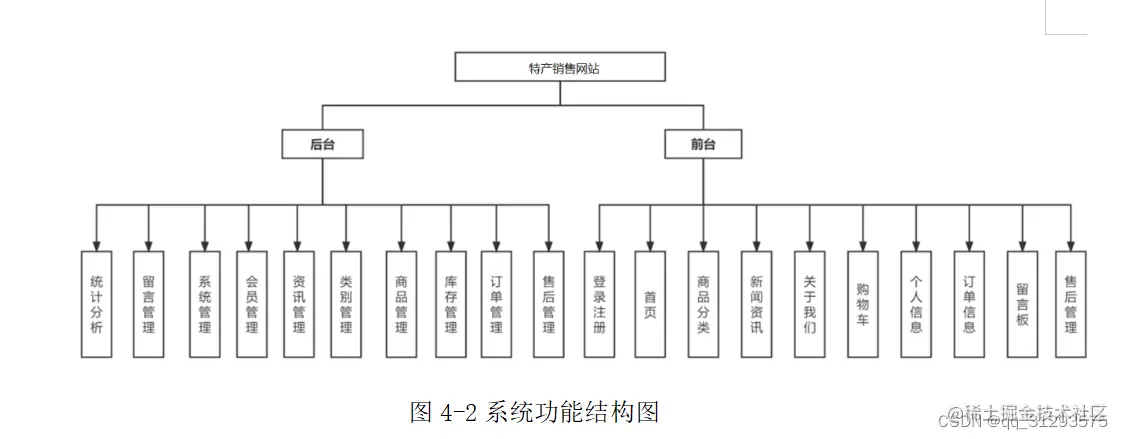 该系统主要由前台和后台两部分组成,后台是由系统管理员进行管理,主要工作是系统维护,管理员主要实现了统计分析、留言管理、系统管理、会员管理、资讯管理、类别管理、商品管理、库存管理、订单管理、售后管理等功能模块;前台是用户使用,主要功能包括注册登录、首页、商品分类、新闻资讯、关于我们、购物车、个人信息、订单管理、留言板、售后管理等。
