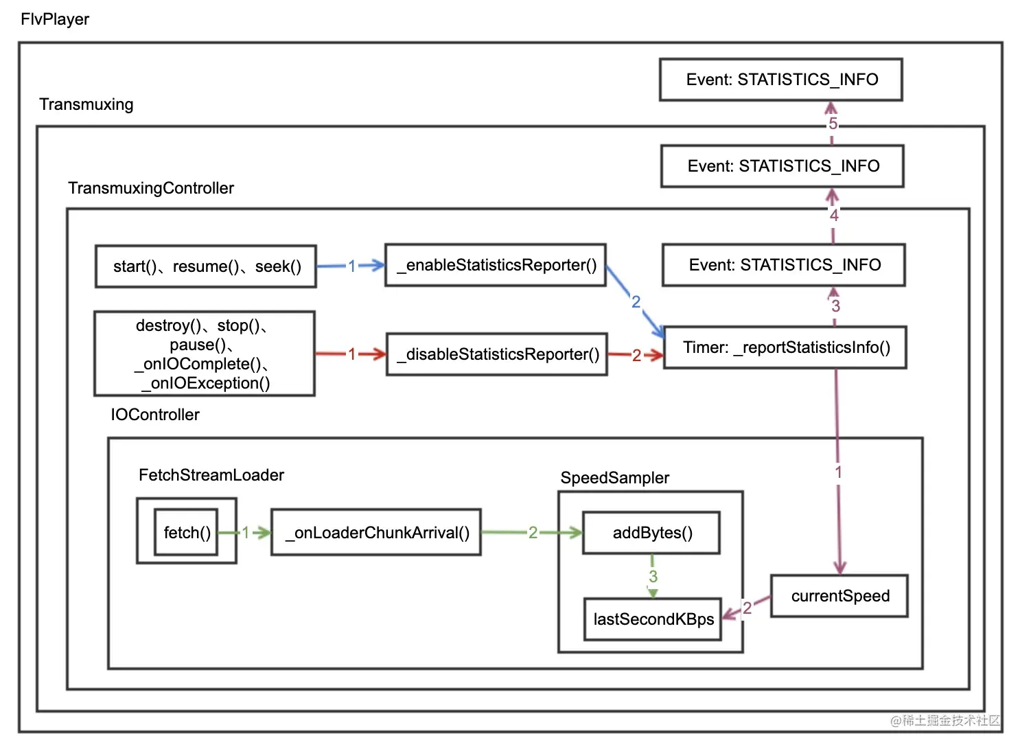 TransmuxingController中控制播放器在加载数据的时候开启定时器获取统计数据,向上触发事件。