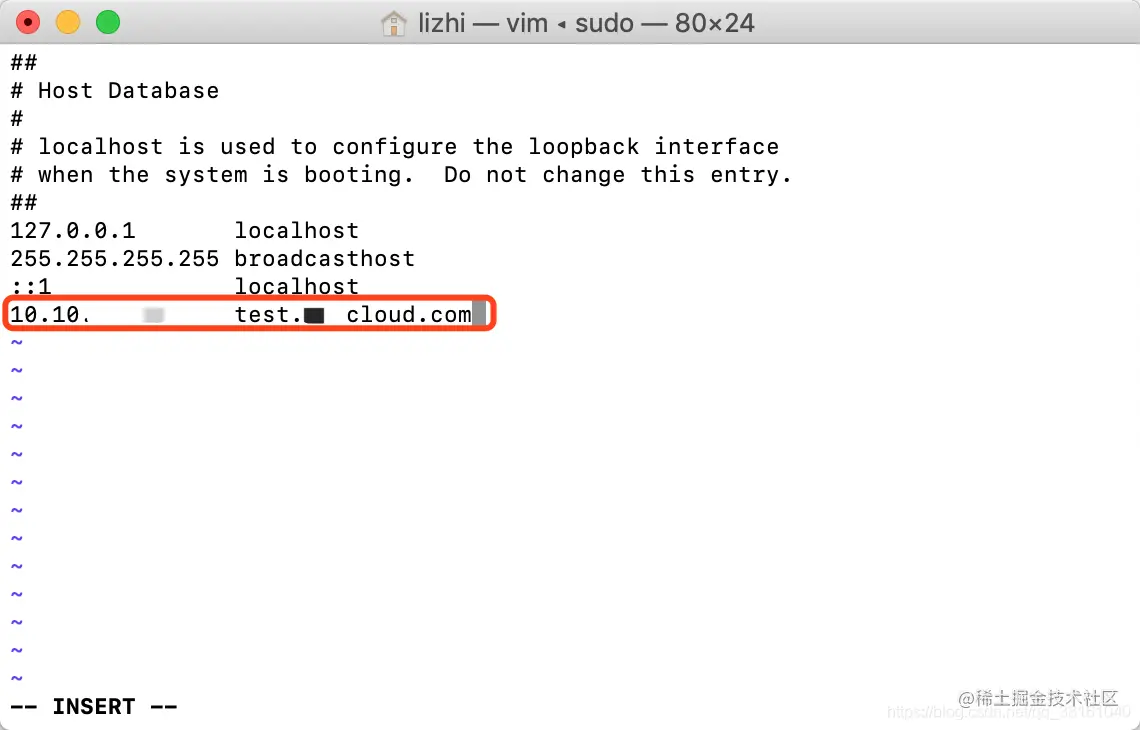 进入后,输入 i 就可以编辑了,可以看到最下面显示的 insert 字样。 我们在下面的位置加上要配置的 ip+空格+ 域名 就好了。