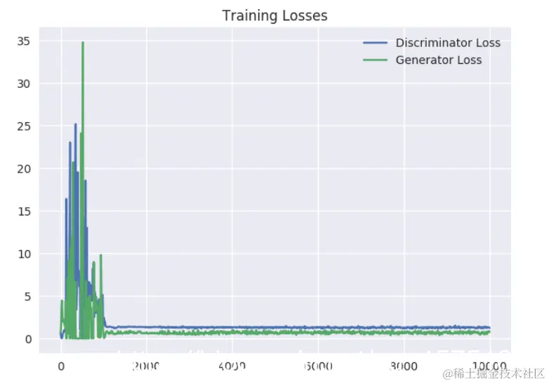 为了更好地理解这个过程中发生了什么,我们可以在每10次迭代后绘制训练损失。从下面的图表中,我们可以看到损失的变化是如何逐渐减少的,并且在训练结束时,损失几乎是恒定的。判别器和生成器的loss的微不足道的变化表明达到平衡。