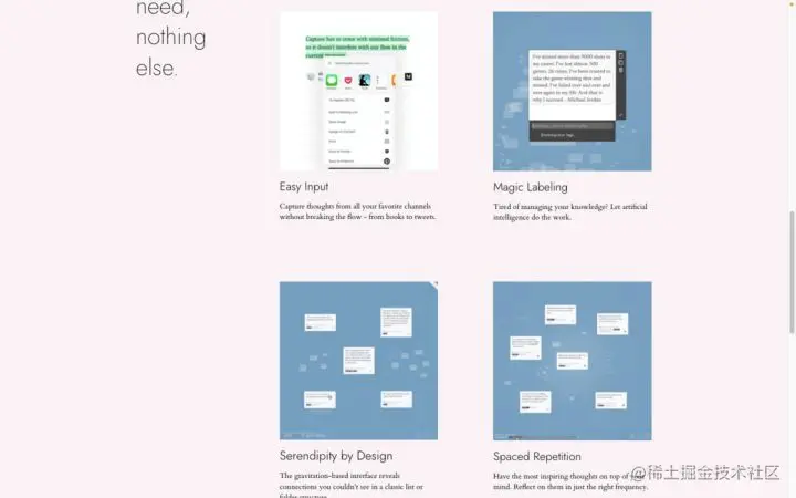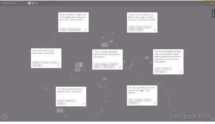 Napkin 设计十分独特,采用了一种力导向图设计的方式。Napkin 引导用户随机查看相关的灵感卡片,以便在随机漫游中探索、深化思想之间的联系。